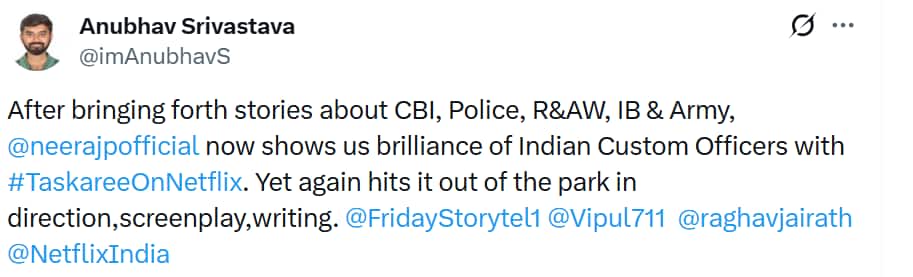 A netizen wrote, "Taskaree: The Smuggler's Web is now streaming on Netflix A raw, intense crime saga diving deep into the world of smuggling, power, and betrayal. Sharp storytelling, gripping tension total binge material."