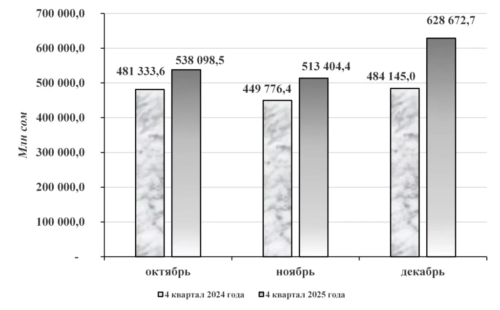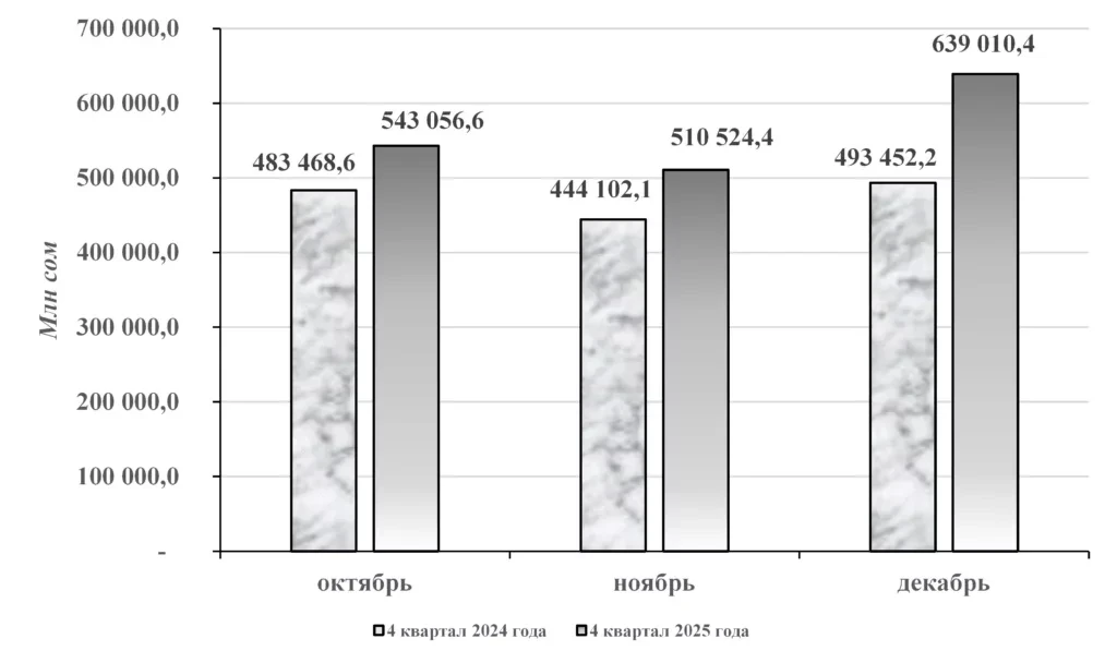 В IV квартале 2025 года из касс коммерческих банков было выдано 1 692 591,4 млн сом, что на 271 568,5 млн сом, или 19,1 процента больше, чем в IV квартале 2024 года.