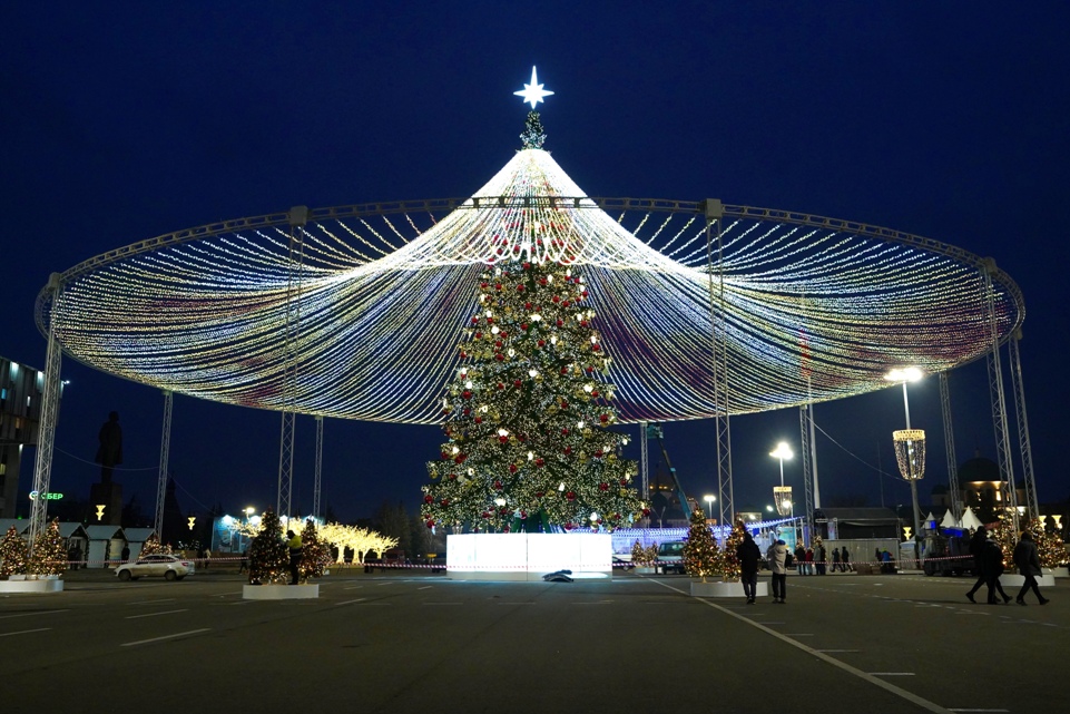 32-метровое дерево стало самой высокой искусственной новогодней елкой в России. Ее особенностью стал мультимедийный шатер диаметром в 60 метров.