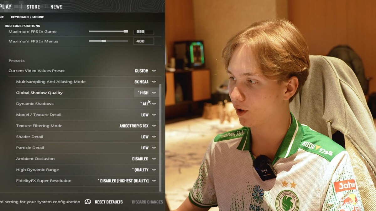 Илья предпочитает играть с минимальной детализацией окружения, но абсолютно не экономит на тенях и сглаживании, которые критически важны для получения информации на сервере.
