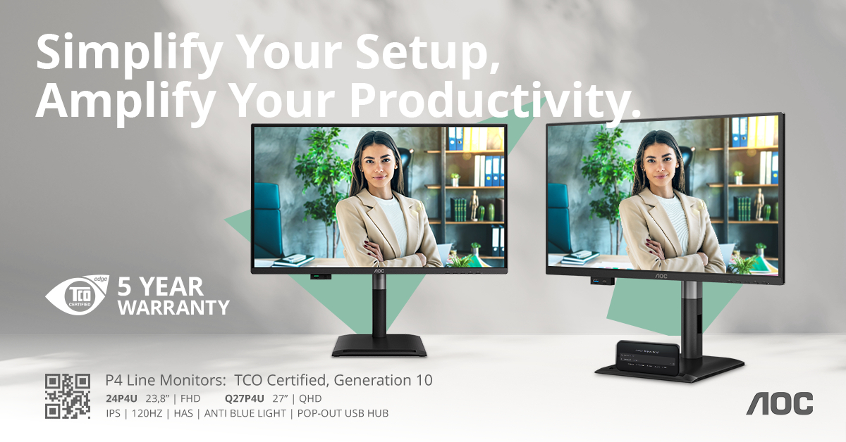 Компания AOC, специализирующаяся на производстве мониторов, с гордостью представляет серию Professional P4 – тщательно подобранную линейку бизнес-мониторов, разработанных специально для профессиональной среды. Серия P4 отвечает растущим потребностям современных сотрудников благодаря частоте обновления кадров 120 Гц во всех моделях, удобному выдвижному USB-концентратору с выделенным портом USB-C и аппаратной технологии Low Blue Light, сертифицированной по стандарту TÜV Eye Comfort. От компактного монитора 24P4U с разрешением Full HD и диагональю 23,8 дюйма (60,4 см) до более крупного монитора Q27P4U с разрешением QHD и диагональю 27 дюймов (68,6 см) – каждый монитор обеспечивает производительность профессионального уровня и возможности подключения, необходимые для современной рабочей среды.