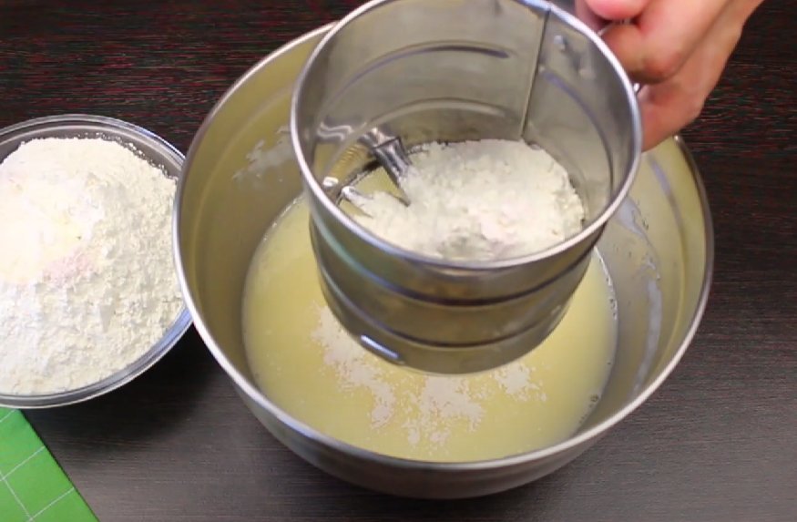 ШАГ 3: В муку добавляем разрыхлитель и просеиваем сухую смесь. Замешиваем тесто.