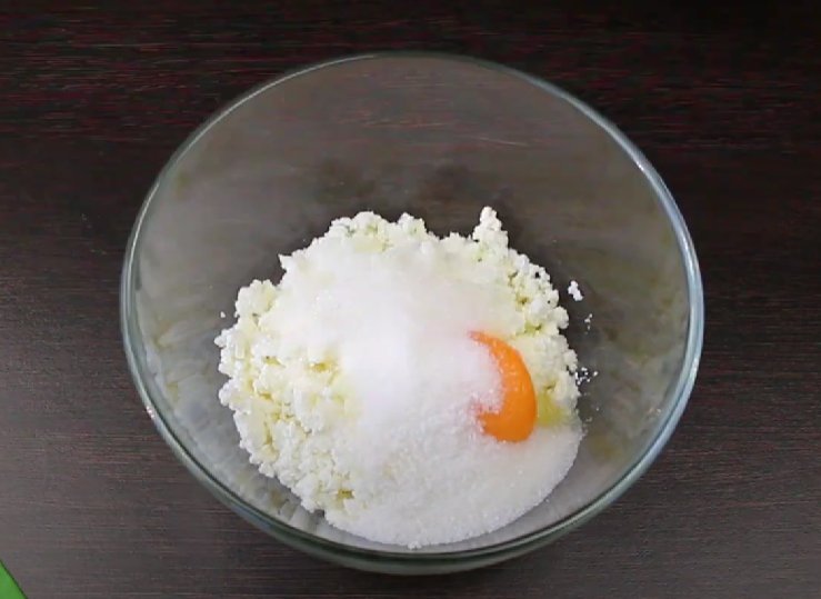 ШАГ 5: Творог смешиваем с сахаром, ванилином и одним яйцом. Перетираем массу.