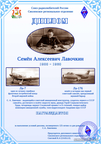 В честь 125-летнего юбилея со дня рождения Семёна Алексеевича Лавочкина разработан и опубликован диплом «С.А. Лавочкин. 1900 - 1960». Диплом размещен на сайте HamClub.ru. Прямую ссылку на диплом можно найти на форуме Смолрадио в теме: Главный раздел» Новые дипломы» Дипломная площадка HAMCLUB.RU (Дипломная программа Смоленского РО СРР).