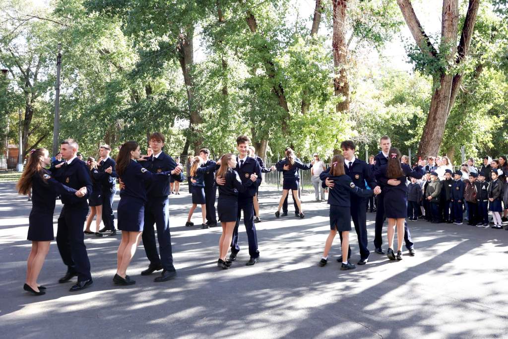 По окончании торжественной церемонии под звуки марша Преображенского полка вынесли флаг, и одиннадцатиклассники закружились в кадетском вальсе.