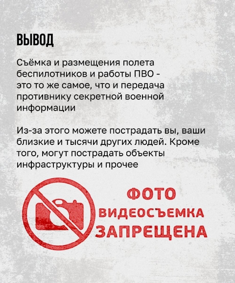 В целях безопасности и защиты государственных интересов в Ростовской области веден запрет на фото-, видео- и киносъемку, а также публикацию в интернете или СМИ процесса или последствий применения ракетного вооружения, БПЛА, мест дислокации и жизнедеятельности воинских частей и подразделений.