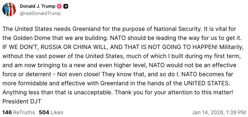 Заявление президента Дональда Трампа, сделанное 14 января 2026 года, перевело дискуссию о покупке Гренландии из разряда «сделки с недвижимостью» в плоскость жесткого противостояния внутри НАТО. Трамп впервые прямо связал обладание островом со строительством «Золотого купола» (Golden Dome) — амбициозной системы противоракетной обороны стоимостью $175 млрд, которая должна полностью закрыть территорию США от любых внешних угроз.