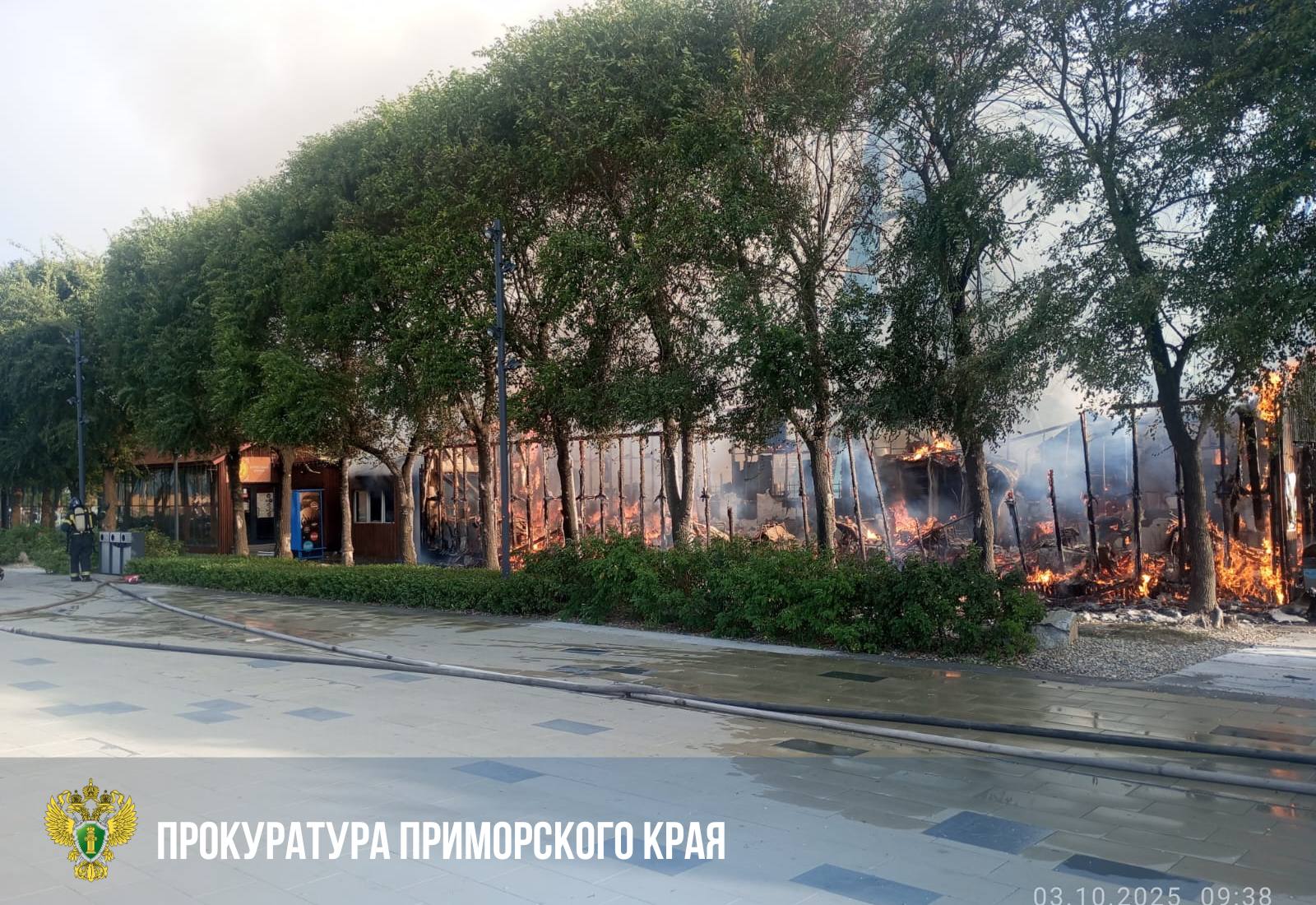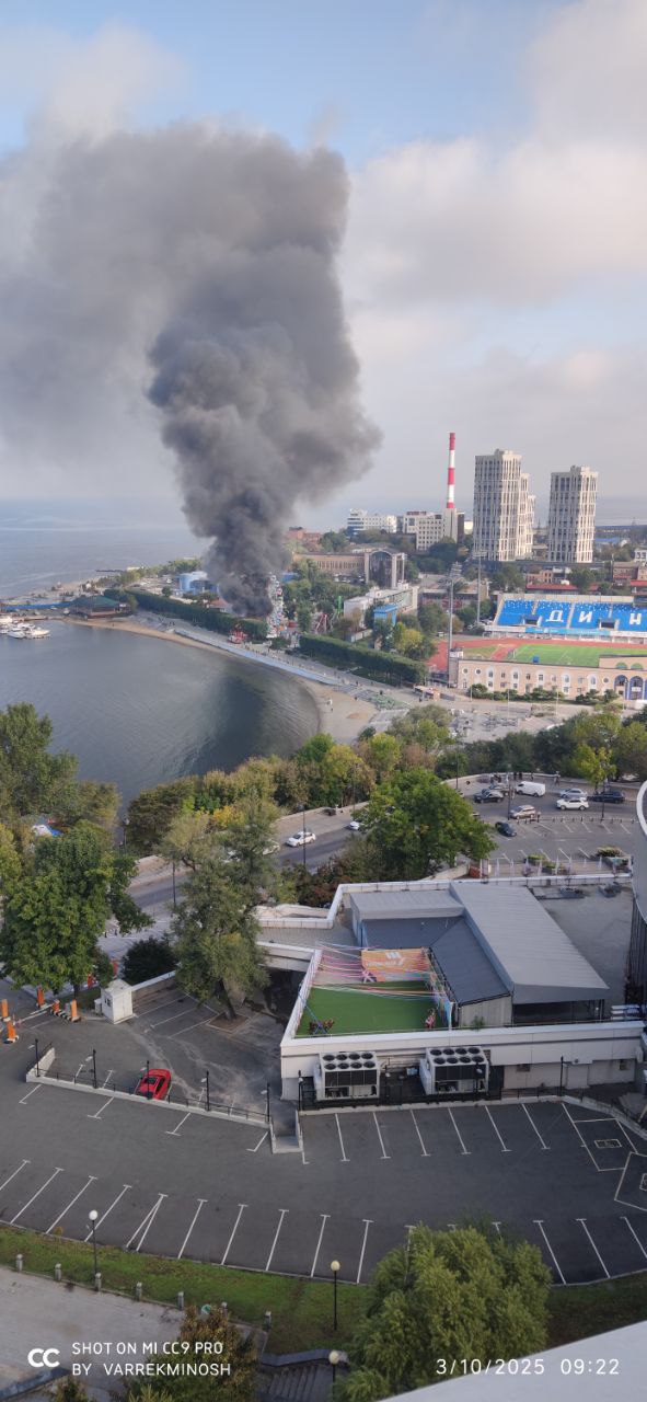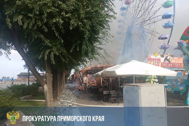 Утром 3 октября загорелось кафе «Стекляшка» на улице Батарейной во Владивостоке. Рядом — колесо обозрения и море.